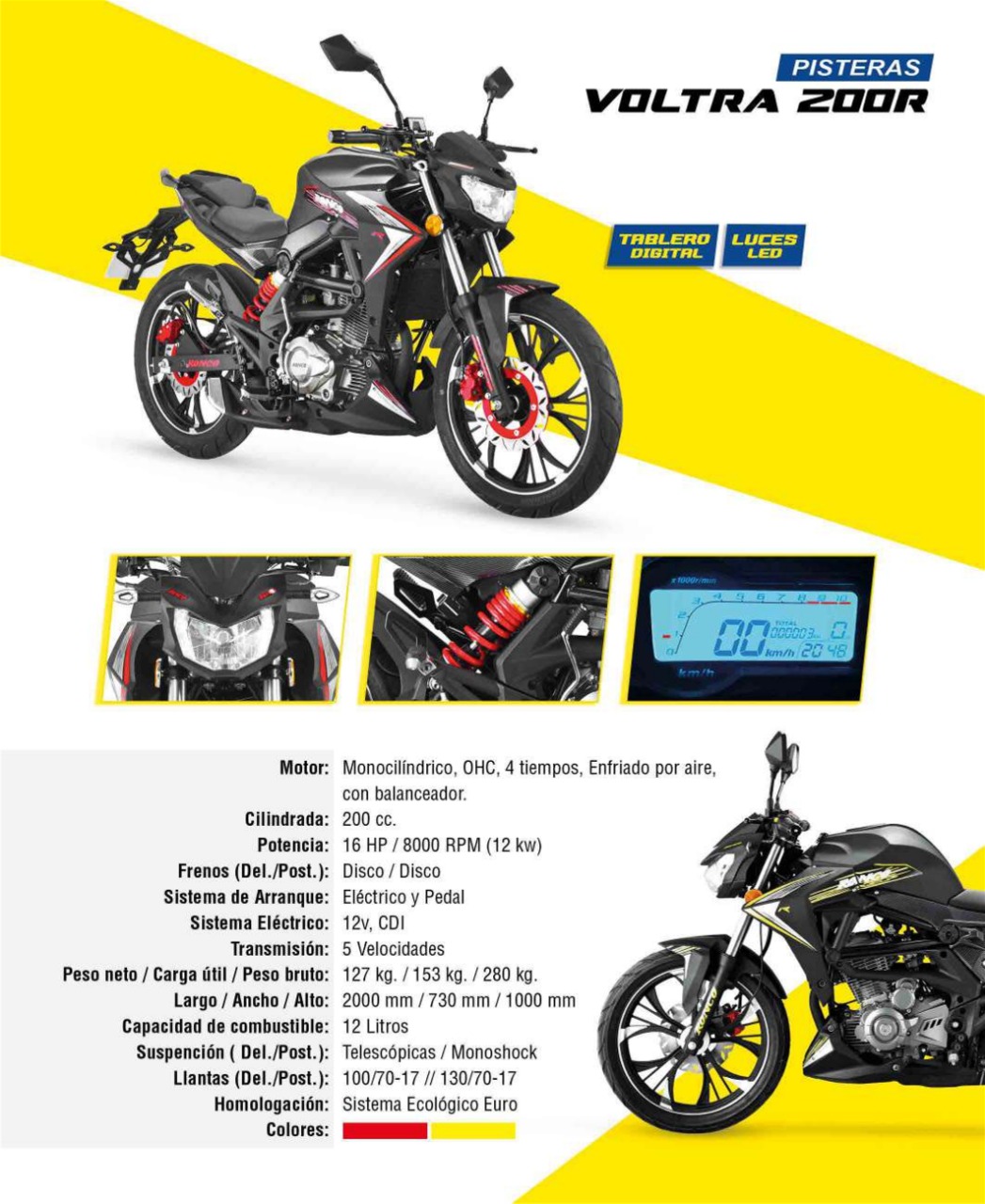 Vive la adrenalina al manejar la Voltra 200 R. Disfruta de un modelo de alta gama de Ronco! Diseño deportivo, OHC 200cc, Potente motor cadenero con balanceador 16HP, Encendido electrico y pedal, Con Monoshock, Asiento dos niveles